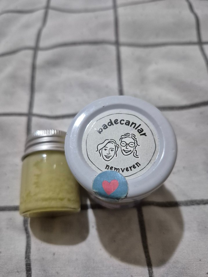 Badecanlar markasına ait, nem veren balm. Küçük kavanozda, üzerinde iki yüz ve kalp etiketi bulunan sade tasarım. Nemlendirme için uygun.