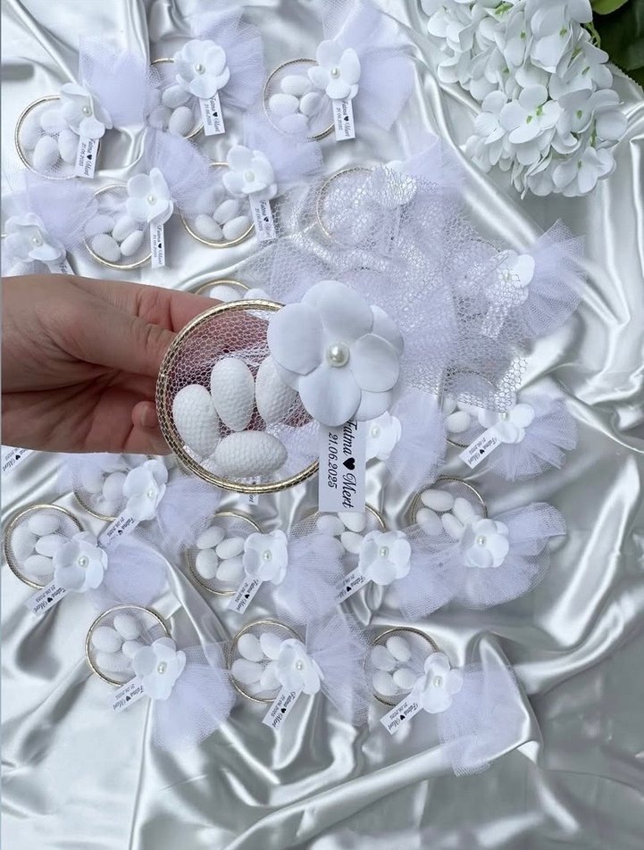 İçinde badem şekeri bulunan, beyaz kumaş çiçek ve tül detaylı nikah şekeri hediyelik.