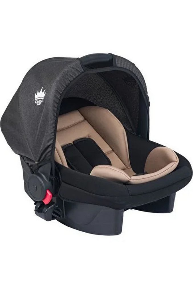 Koyu kahverengi yastıklı iç kısmı ve koruyucu siyah tente bulunan bebek araba koltuğu, güvenli kayışlar ve sağlam taban sunar.