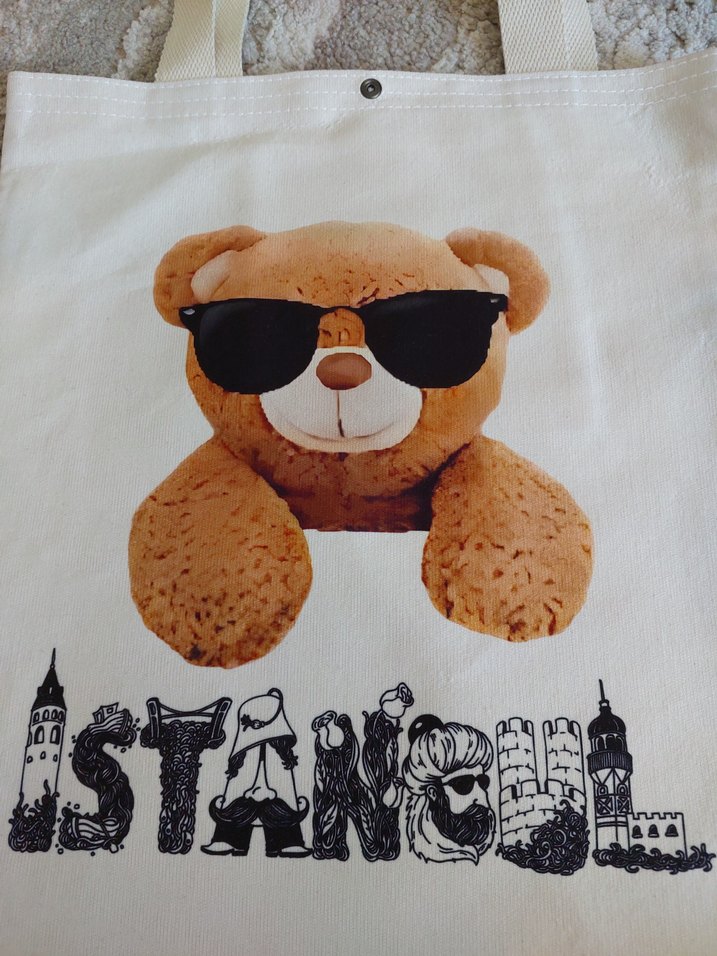 Beyaz kumaş üzerinde güneş gözlüklü açık kahverengi peluş ayı baskısı ve altında "Istanbul" yazısı yer alıyor. oldukça kalilidir eni 37 cm boyu 43cm