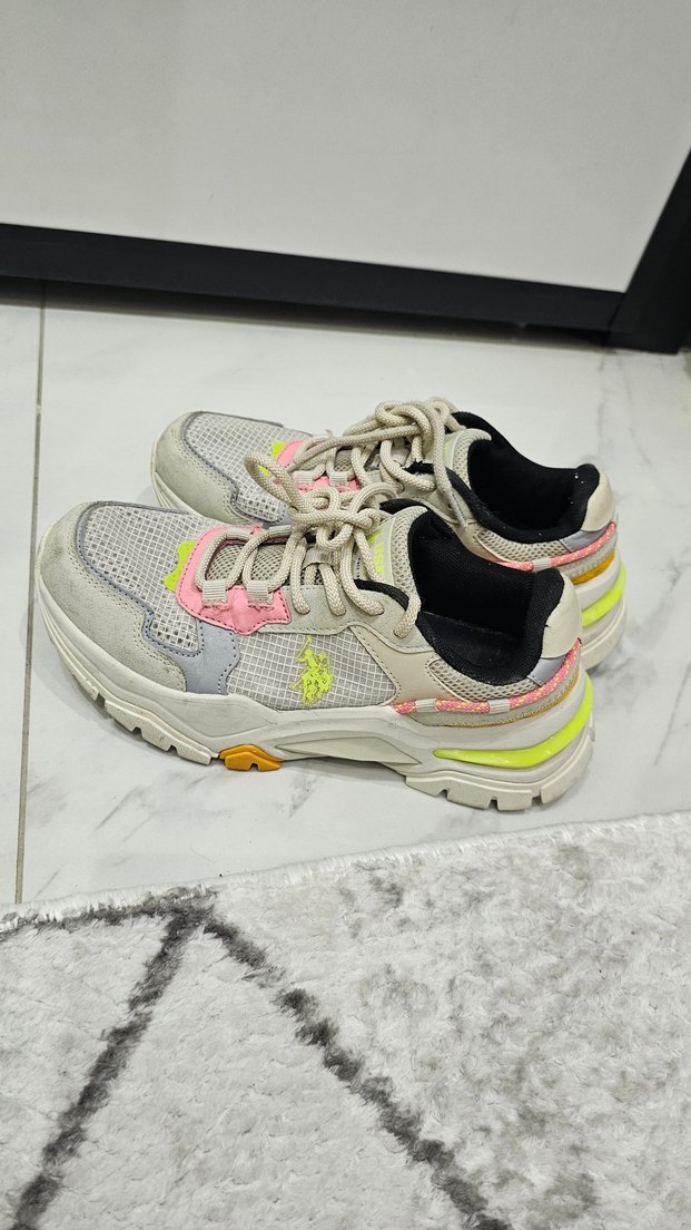 Bağcıklı, beyaz renkli platform topuklu sneakers. Lastik tabanlı ve tie-dye desenli, sportif ve trend sokak giyimi için uygun. us.polo 36 numara tertemiz