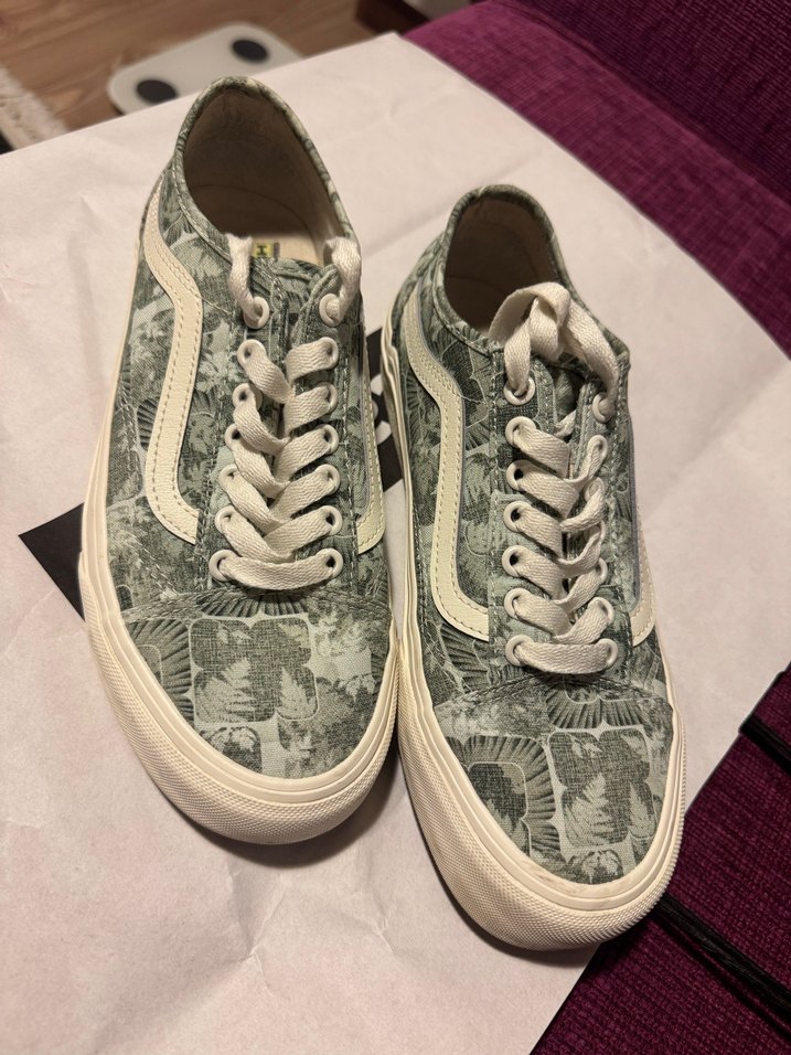 Bağcıklı, düz tabanlı, beyazli-yeşil batik desenli kadın spor ayakkabısı, günlük kullanım ve sokak stiline uygundur. 39 numara vans Defosu yok Fotograflar guncel Oldukca iyi durumda