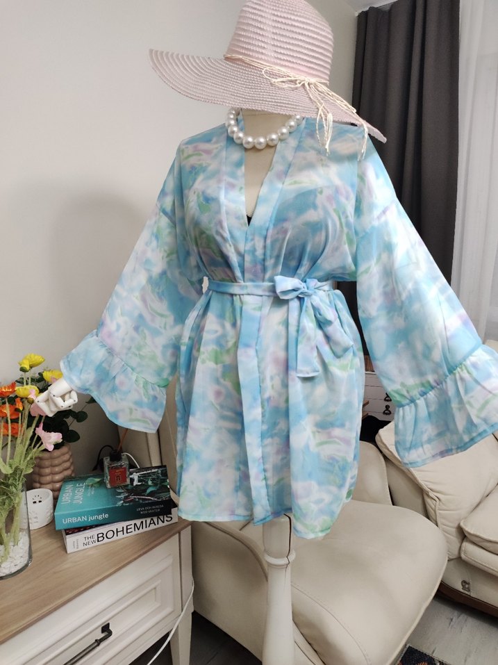 Bağcıklı, straplez, bol kesim mini kimono, pastel mavi batik desenli. Yumuşak sentetik kumaştan, uzun dökümlü kollu, bohem tarzda. Bel kemeri ve "BOHEM" yazısı mevcut.