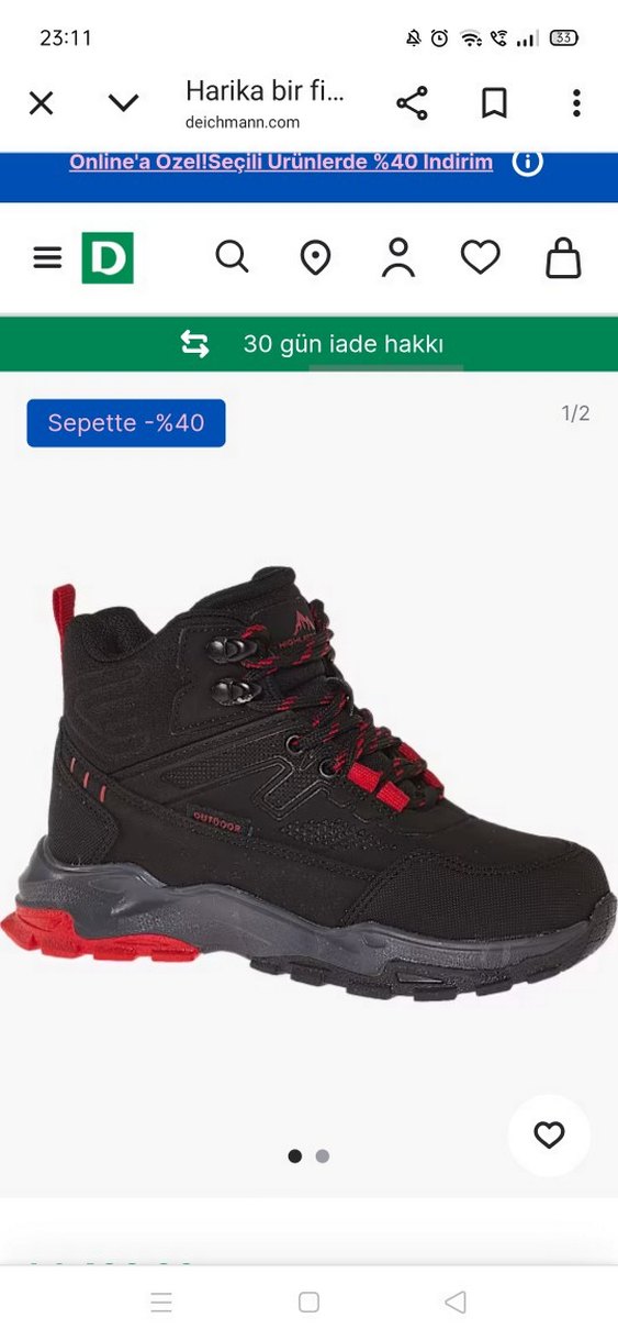 Kızıl siyah renklerde, bağcıklı çocuk botu. kauçuk malzemeden, sokak stili için uygun. 33 no bir kere giyildi