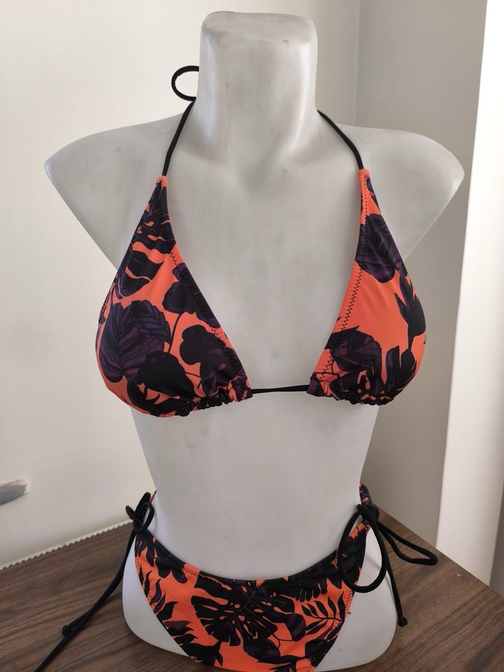 Kadınlar için bağlı ip detaylı, çok renkli koyu tie-dye desenli, kısa ve vücuda oturan bikini. Yeni ve kullanılmamıştır.