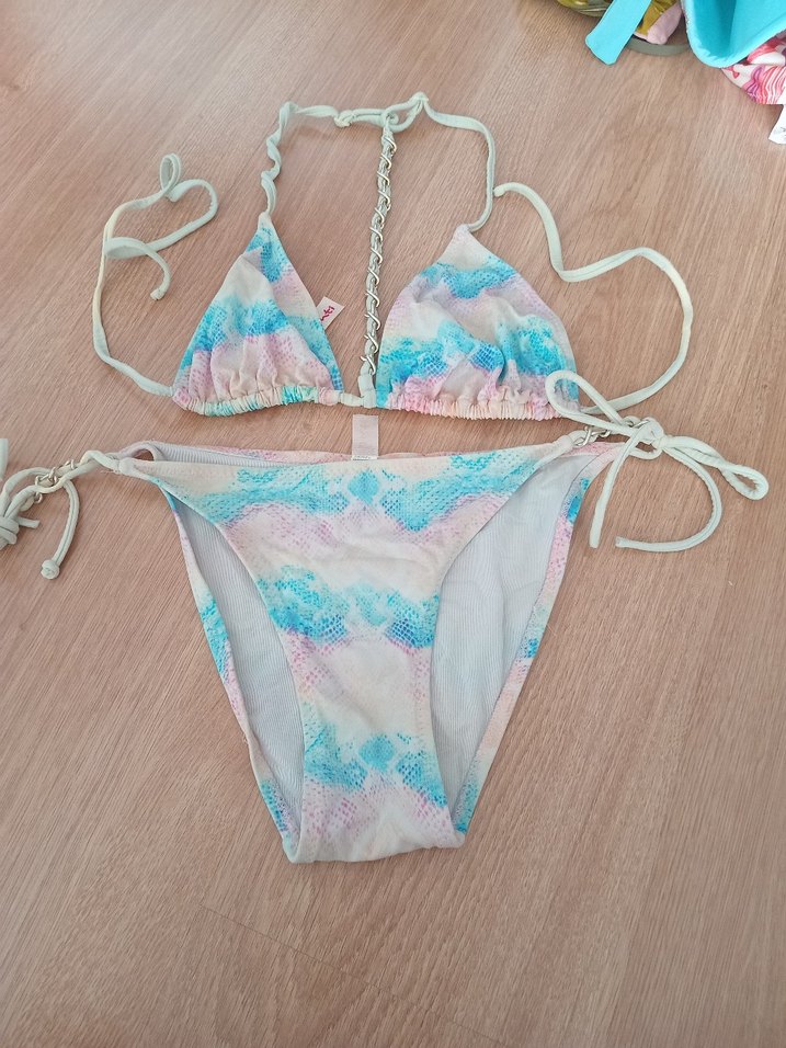 Bağcıklı, dantel detaylı ve pastel tonlarda çok renkli tie-dye desenli, bohem tarzda kadın bikini. alt 36 ust 38