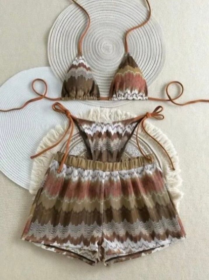 Bağcıklı, kısa kesim, açık kahverengi tonlarda tie-dye desenli, dantel ve ince askılı, bol kesim kadın bikini seti. Shein den aldım