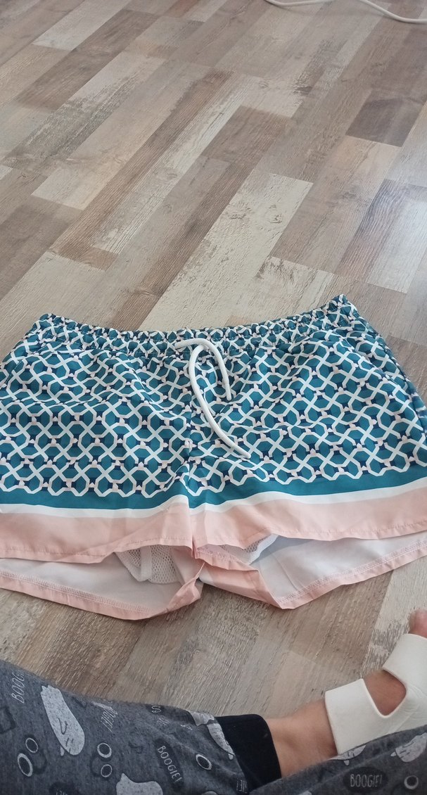 Sentetik kumaştan, bağcıklı ve pastel mavi renkli geometrik desenli bol kesim deniz şortu. Plaj ve sokak stili için uygundur.