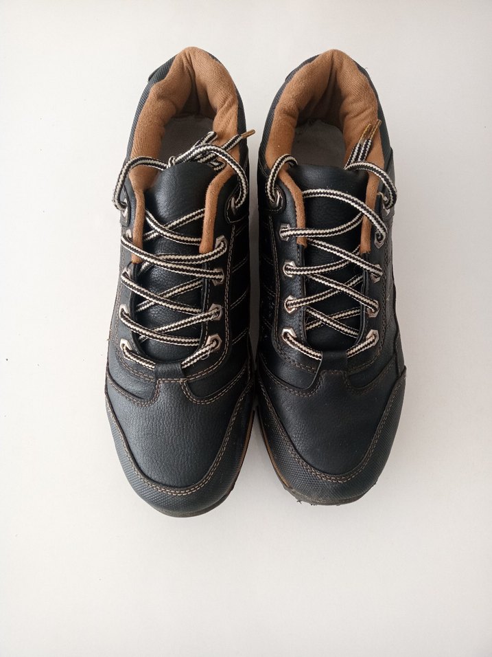 Bağcıklı, kahverengi iç astarlı siyah erkek outdoor ayakkabısı. Kauçuk malzemeden, günlük kullanıma uygun sokak stili ayakkabı.