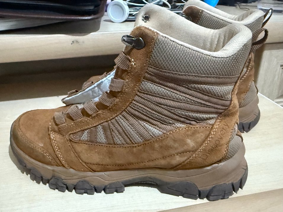 Bu erkek botları kahverengi süet ve gri kumaştan yapılmıştır, bağcıklı kapama ile günlük sokak stili için uygundur. 38 numara bagcıksız
