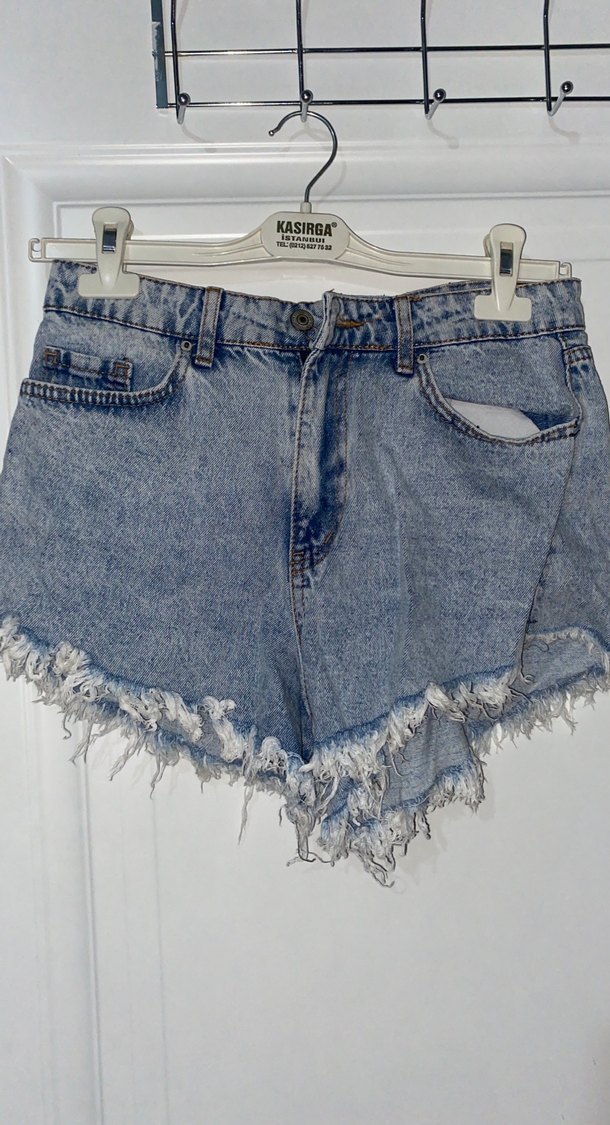 Bağcıklı, bol kesim, kısa boy kot şort, gri batik desenli. Günlük sokak stili için uygun.