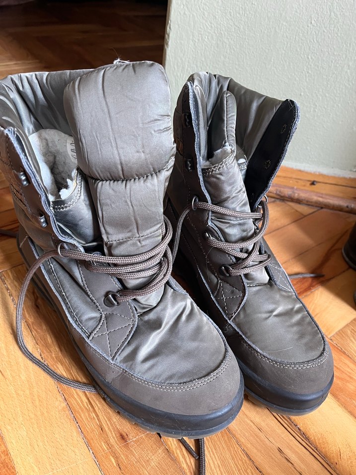 Bağcıklı kayışlı, içi yumuşak dolgulu kahverengi kadın kayak botu. Günlük sokak kullanımı için uygundur.