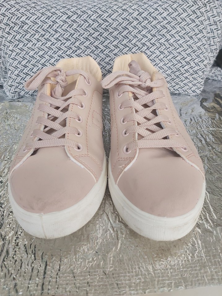 Pudra renkli, bağcıklı sneaker.39 numara.3-4 defa kullanıldı. Normalde 38,5 giyerim.Bana oldu.