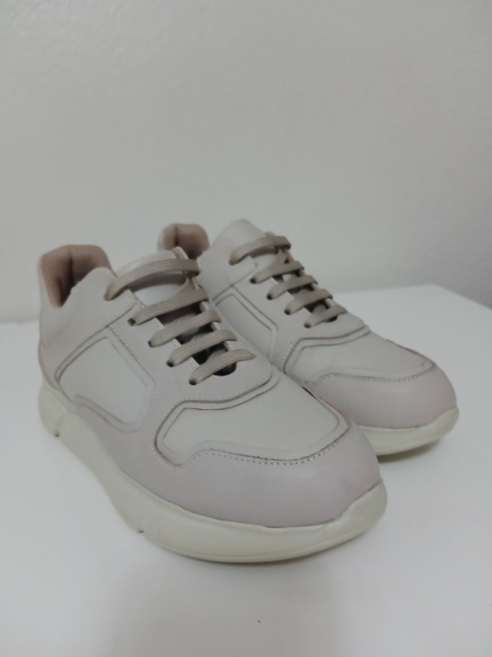 Bağcıklı, düz tabanlı kauçuk malzemeden yapılmış kadın spor ayakkabısı. Hiç kullanılmadı.