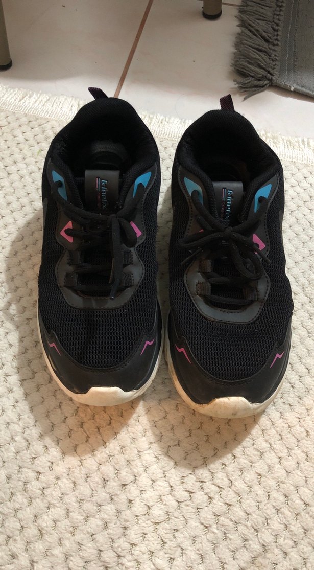 Bağcıklı, çok renkli kadın spor ayakkabısı. Kauçuk tabanlı, ince topuklu, spor ve sokak stili için uygun.