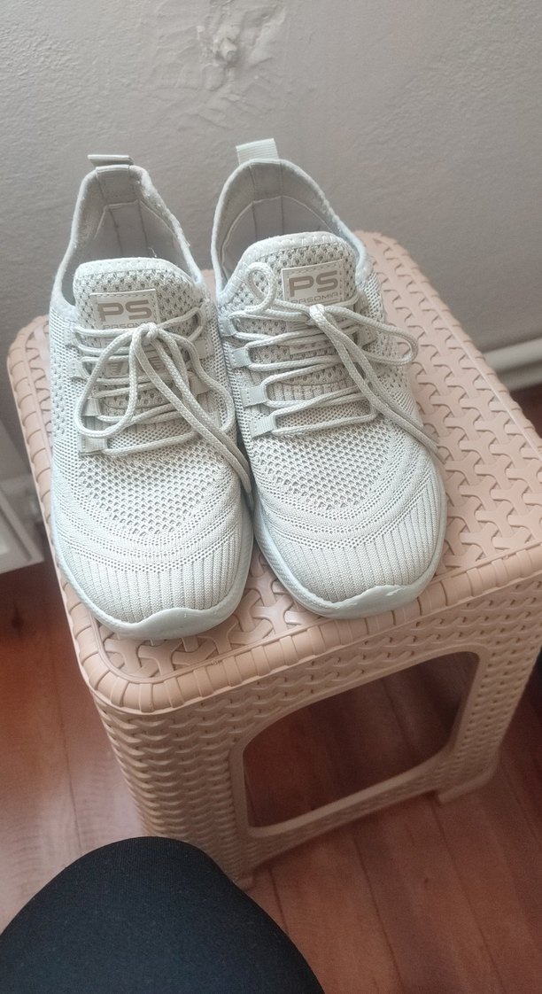 Yumuşak kauçuk tabanlı, beyaz bağcıklı kadın spor ayakkabısı. Sokak stili ve hafif gri tonlar içerir.