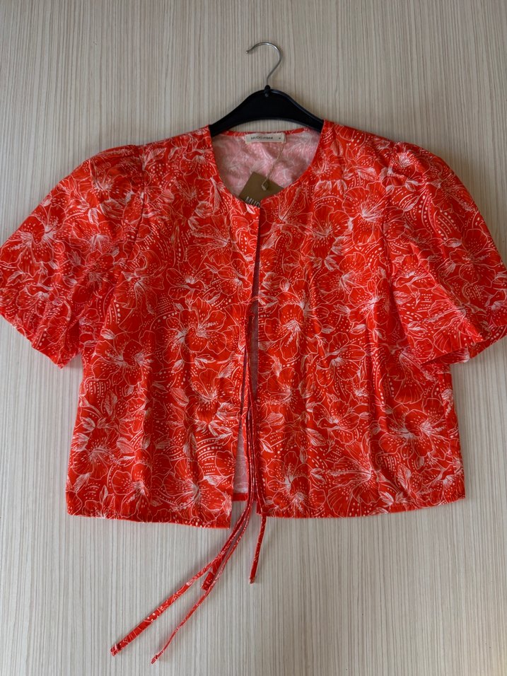 kısa kollu, bağcıklı ve düğmeli bluz. Renkli desenli, sentetik kumaştan, bohem tarzda rahat kesim.