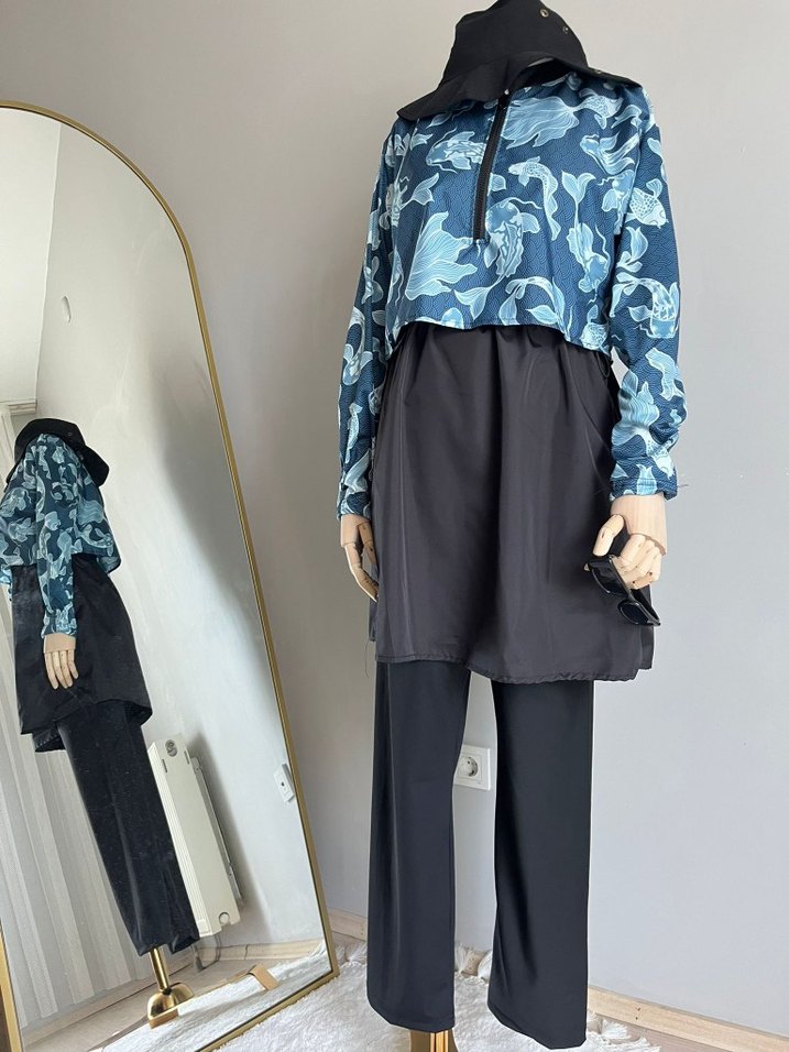 Bol kesim, kısa boy ve yüksek yakalı hamile tunik. Uzun kollu, mavi batik desenli, sentetik kumaştan, bel detaylı. 36 44 bedene kadar