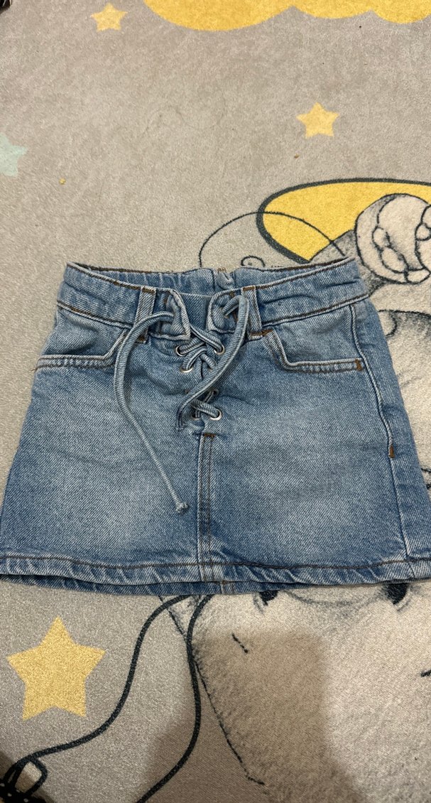 Bağcıklı ve kemerli, mavi tonlarında hafif batik desenli, dar kesim mini kot etek.