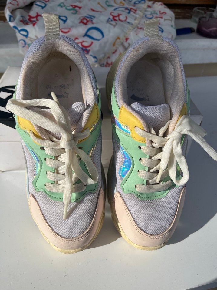 Bağcıklı, pastel çok renkli bağcıklı kız çocuk spor ayakkabısı, spor ve sokak stili karışımıdır. Temiz giyilmiş rahat tasarım