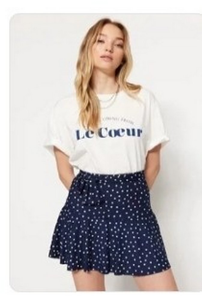 Bol kesim mini etek, volan detaylı ve puantiyeli. Günlük rahat sokak stili için uygun.