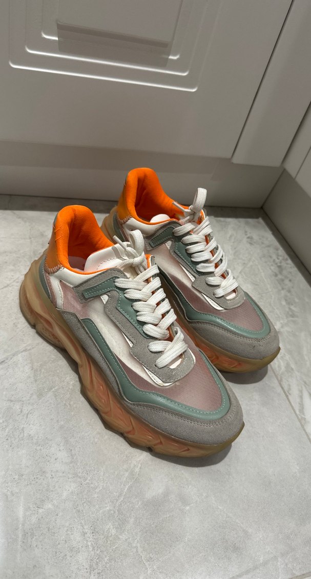 Bağcıklı, pastel tonlarda tie-dye desenli, stiletto topuklu kadın spor ayakkabısı. Kauçuk taban ve canlı turuncu iç detayları bulunur.