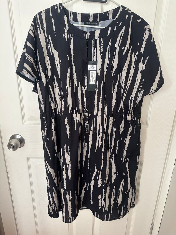 Hiç kullanılma yakası ağraflı, V yakalı, siyah ve gri tie-dye desenli, kısa kollu, bol kesim elbise . Midi boyda, rahat sentetik kumaştan günlük kullanıma uygun. İki kol arası göğüs 64 cm Büzgülü açılmış hali 59 cm koldan yakaya 32 cm yaka genişliği 24 cm omuzdan etek 97 cm etek genişliği 69 cm
