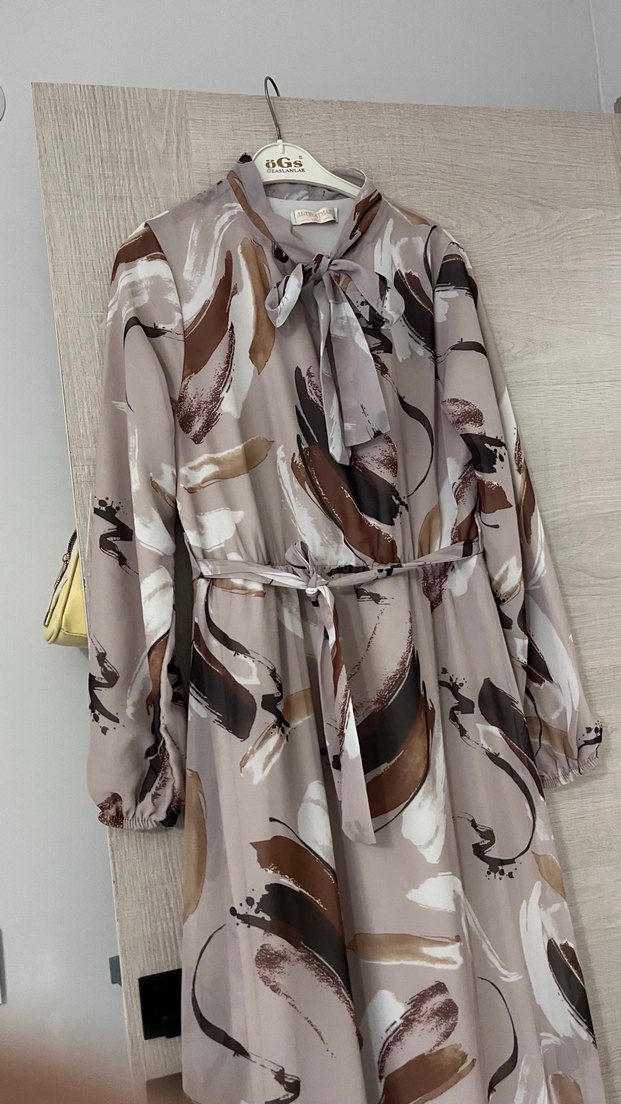 Yüksek yakalı, uzun kollu ve bol kesimli uzun elbise. Bej tonlarında bağcıklı ve batik desenli. Pürüzsüz sentetik kumaştan, günlük kullanıma uygun. Şifon ve astarlı kumaş