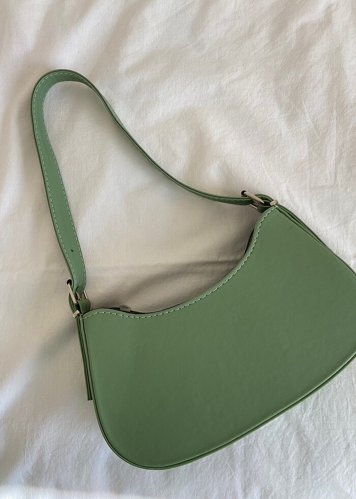 Yeşil baget çanta, 1 adet iç cep bulunmakta daha hiç kullanılmadı. Çanta benim elime de ulaştığında etiket mevcut değildi