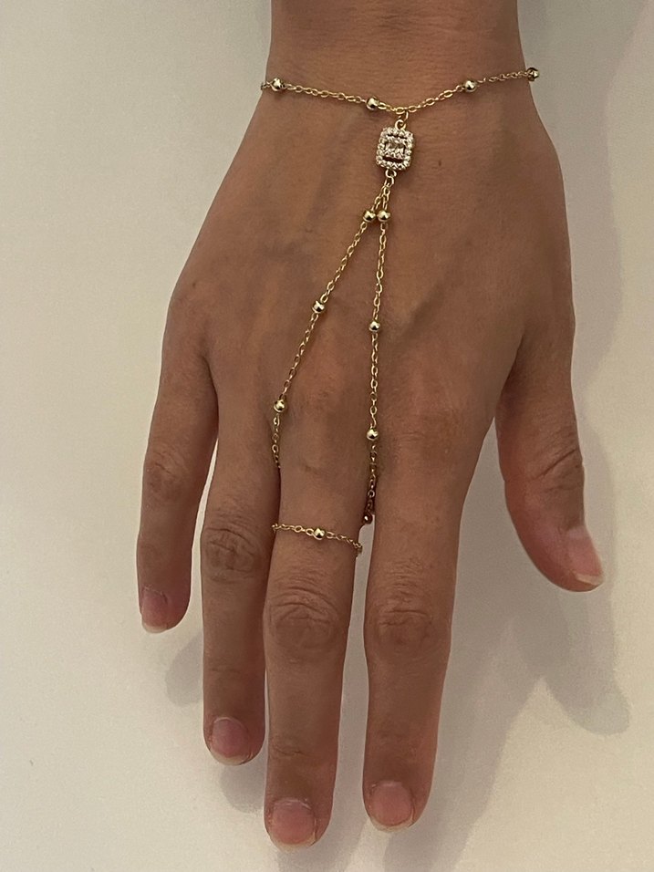 Altın renkli, zincir detaylı ve baget desenli taşlı kadın el zinciri Şahmeran Günlük kullanıma uygun bohem tarzda.