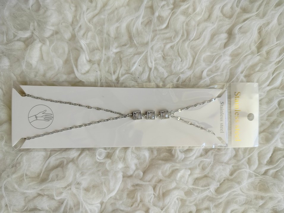 Minimalist tasarımlı beyaz el zinciri, zincir detayları ve üç kare yılan deseniyle düğünlere uygun klasik ve bohem şıklığı bir araya getirir. ✨LÜTFEN SATIN ALMADAN STOK SORUNUZ ÜRÜNLERİMİZ 316 L ÇELİK STAİNLESS STEEL MARKA GARANTİLİDİR GÖNÜL RAHATLIĞIYLA UZUN SÜRE KULLANABİLİRSİNİZ İNSTA:dorataki46