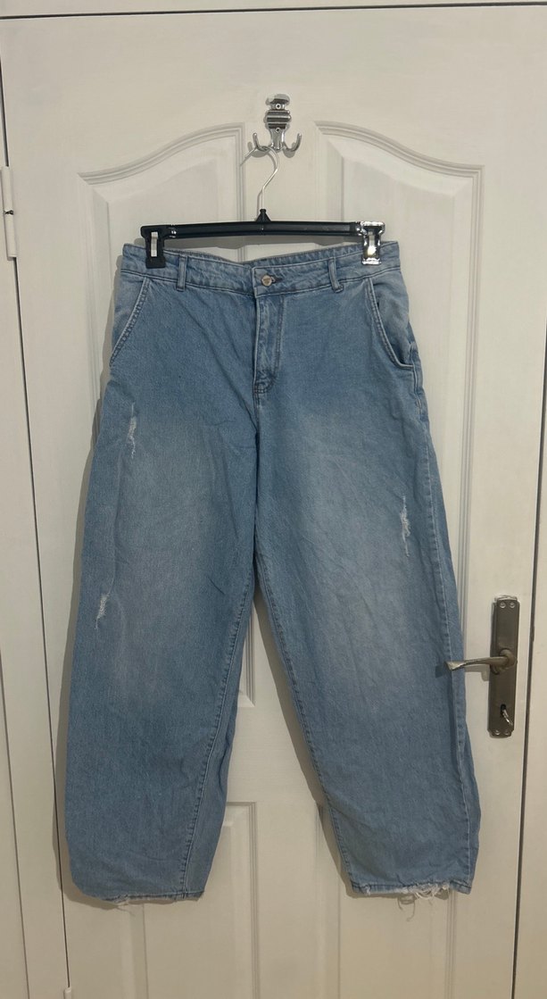 Bu mavi denim pantolon, midi boy ve bol kesimiyle günlük rahat kullanım için zahmetsiz şıklık sunar. Desensiz tasarımı sokak stiline uygundur.