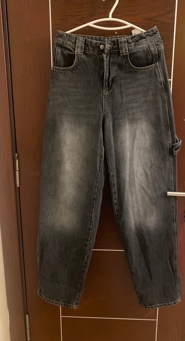 Gri renkli, bol kesim ve normal boy kot pantolon, tokalı detay içerir. Günlük sokak tarzı için uygundur.