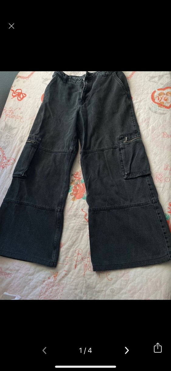Siyah bol kesim kot pantolon, kemerli ve çok cep detaylıdır. Dayanıklı denim kumaştan yapılmış, günlük sokak stili için uygundur.