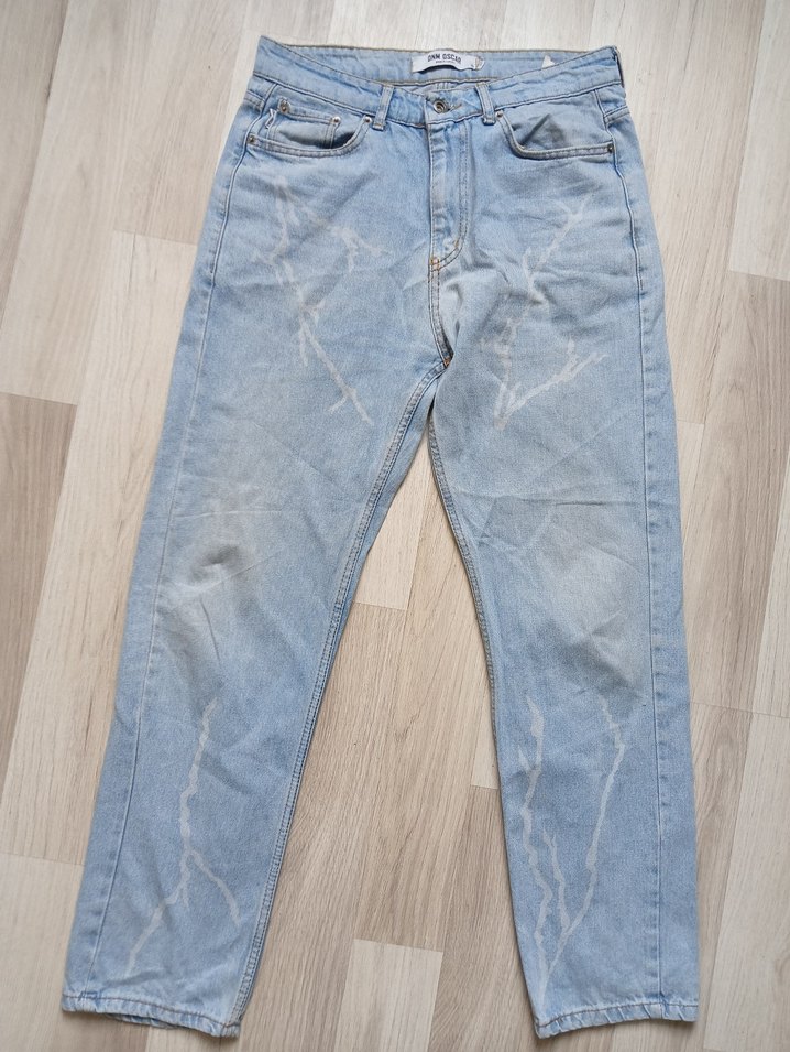Geçişli mavi tonlarında, bol kesim, normal boyda denim kot pantolon. Sokak modası tarzında, günlük kullanıma uygun, rahat ve şık görünümlü.