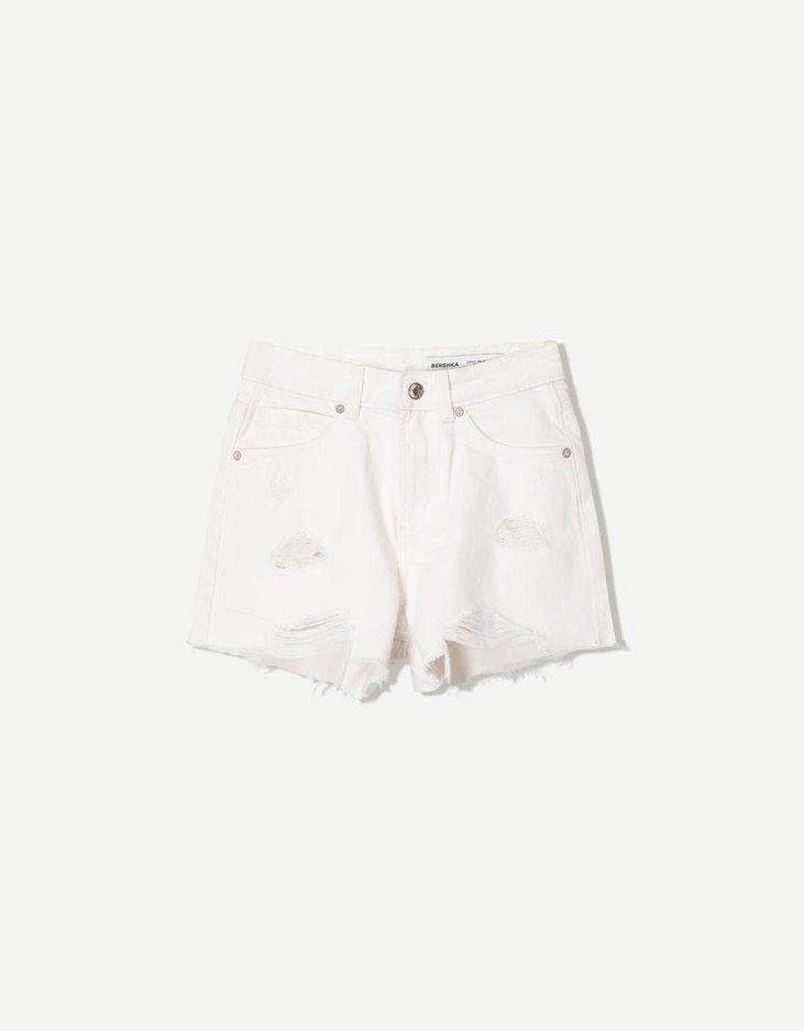 Bağlama desenli, hafif yırtık detaylı beyaz, bol kesim mini denim şort, sade ve günlük kullanıma uygun tarz sunar.