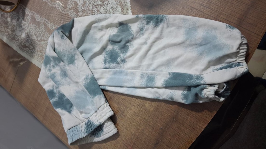 Bağlama desenli gri ve beyaz renklerde, düğmeli, bol kesim hamile eşofmanı. Yumuşak dokulu kumaştan, midi boyda, rahat kullanım için lastikli paçalar içerir.