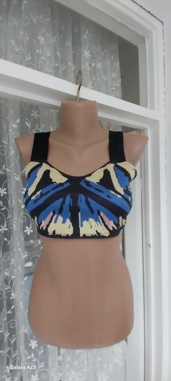 Geniş siyah askıları ve mavi bağlama desenleriyle kısa kesim, streetwear tarzında bustiyer Rahat ve şık bir seçim.