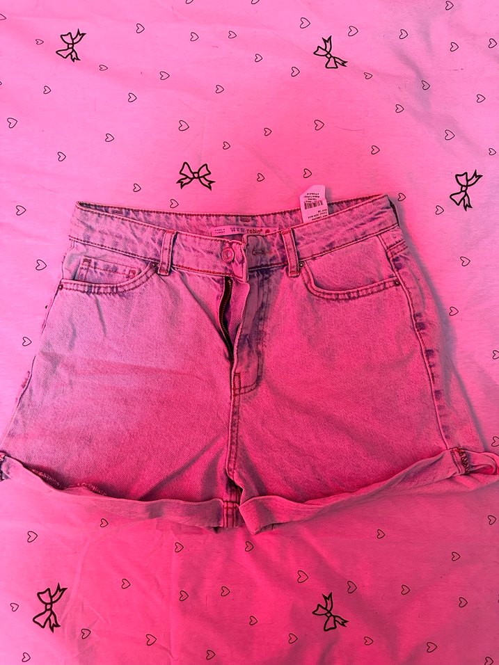 Bağlama desenli, pembe renkli, bol kesim mini kot şort. Rahat ve şık görünüm için günlük kullanıma uygundur.