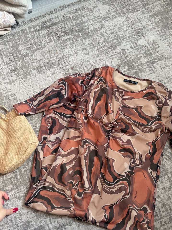 Kahverengi ve gri bağlama desenli, kısa kesim, rahat hamile bluzu, drapeli ve yuvarlak yakalı, yumuşak sentetik kumaştan.