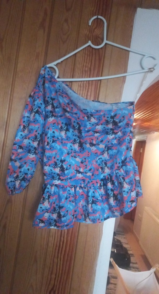 Mavi bağlama desenli, tek omuzlu, uzun kollu, bol kesim kısa mini bluz. Sentetik kumaştan, drapeli, bohem tarzda, dış mekanlar için uygun.