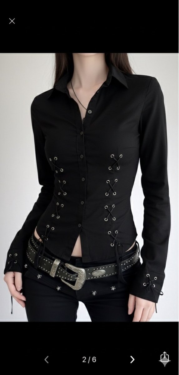 Bu düğmeli siyah gömlek, Bedenleri mevcut, yeni ilan actırınız işlemeli detaylara sahip askılı kollu ve halter yaka ile cesur gotik tarz sunar.