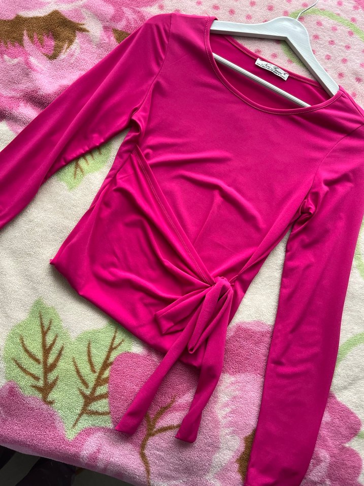 Drapeli detaylı, uzun kollu ve bisiklet yaka pembe fuşya kadın bluz. Sentetik kumaştan üretilmiş, günlük kullanıma uygun renkli ve şık bir model. Bağlamalı bel kısmını kendşne göre ayarlayabilirsiniz görselde ekledim alt kısında dikişler var ama pantolonun içine koyarak kullandım ben hiç görünmüyor ve sökülme yok