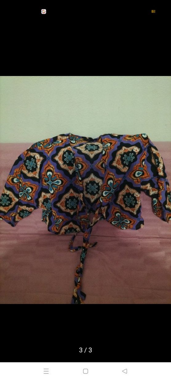 Bağlamalı, uzun kollu, kayık yaka kadın bluz. Koyu çok renkli batik desenli, bol kesim ve kısa boyda, günlük kullanım için uygundur.