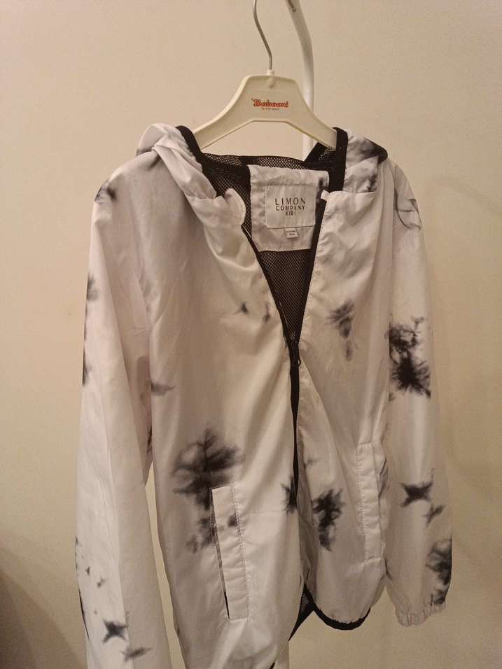 Bağlamalı desenli, uzun kollu, notlu yaka tasarımlı, bol kesim beyaz çocuk ceket. Günlük sokak stili için uygundur.