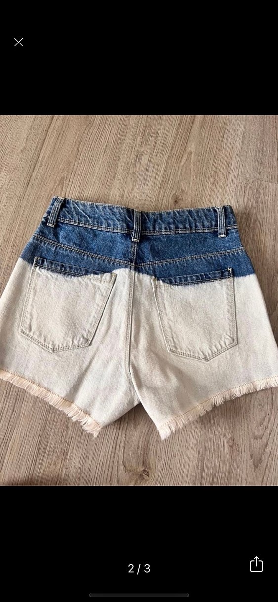 Bağlamalı desenli, açık mavi tonlarında, cepli ve düğmeli mini kot şort. Rahat kesimi ve püsküllü etek ucu ile günlük sokak stili için uygun.