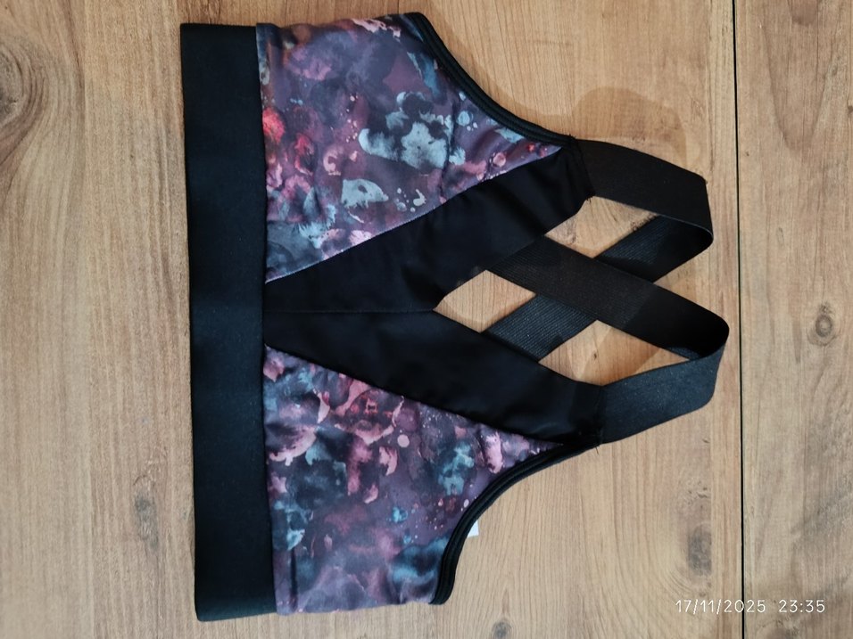 Koyu renkli çok renkli bağlamalı desenli mini spor sütyeni, gotik tarzda ve geniş siyah askılarla destek sağlar.