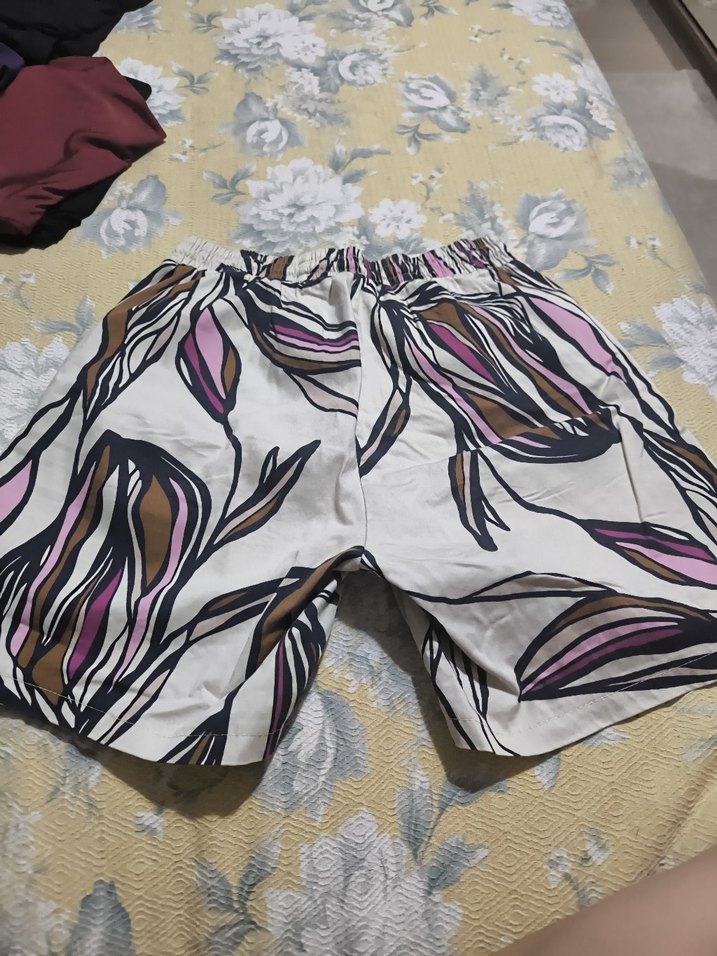 Hafif sentetik kumaştan, bağlamalı desene sahip, elastik bel bantlı ve rahat kesimli hamile şortu. Günlük kullanım için uygundur.