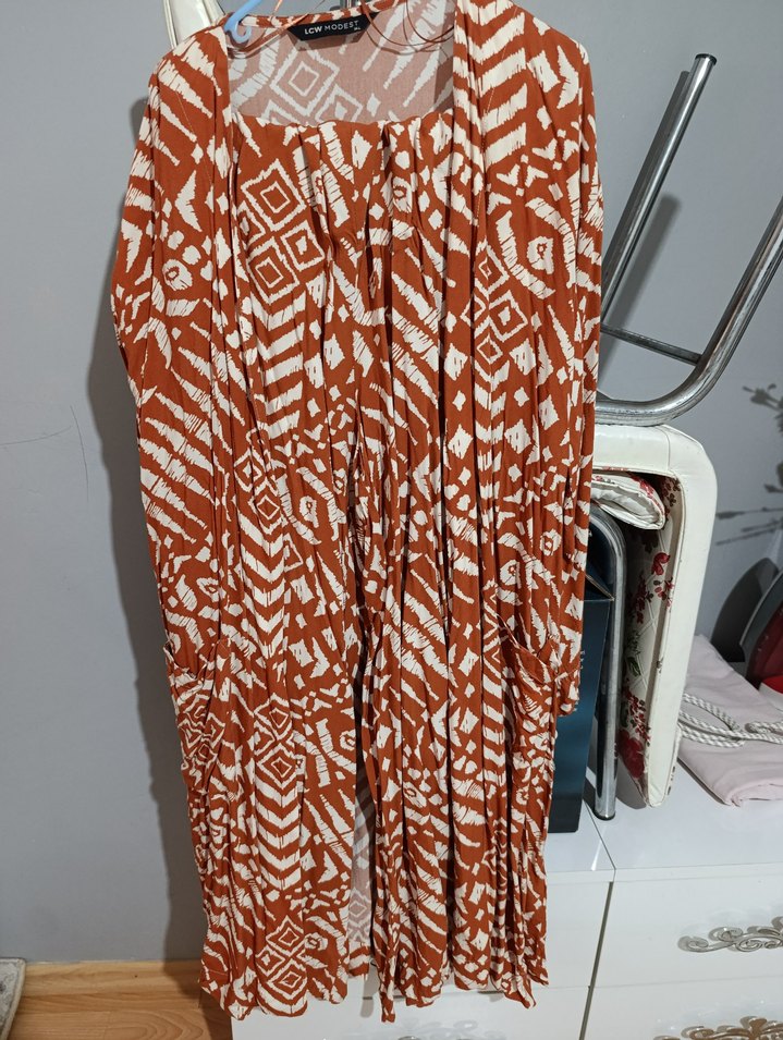 Uzun, bol kesim, bağlamalı kahverengi desenli, kayık yaka ve uzun kollu. Bohem tarzda drapeli görünüm sunar.