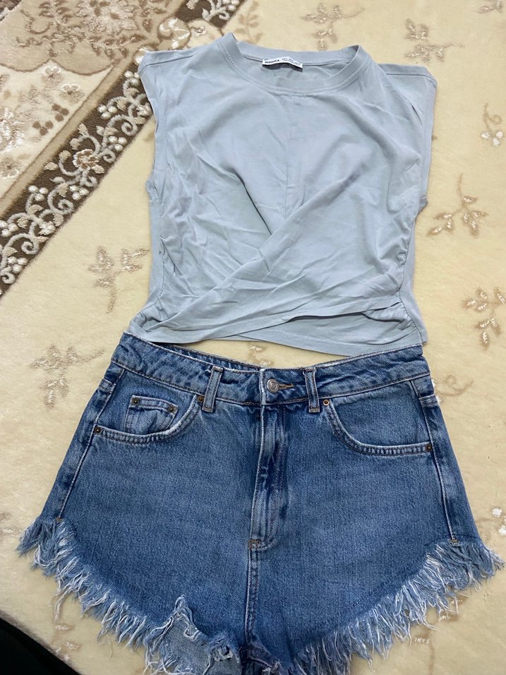 Bağlamalı Gri Tişört ve Püsküllü Mavi Denim Şort